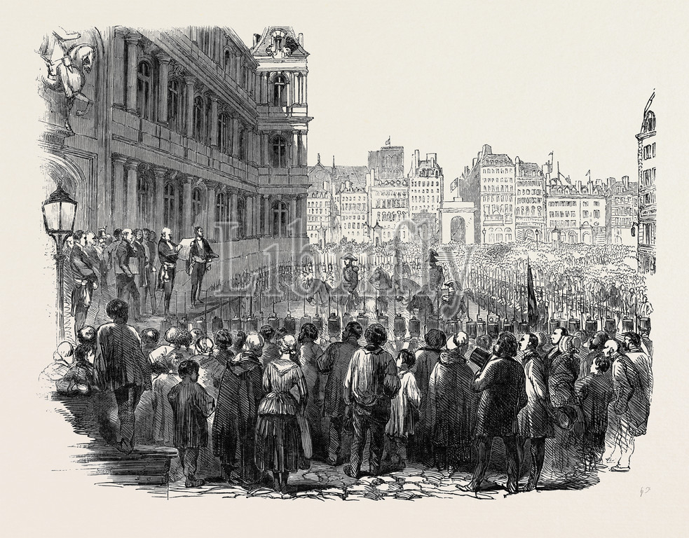 proclamation, successful, candidates, department of the seine, hotel de ville, paris, france, crowd, 1850 engraving, engraved image, history, illustrative technique, engravement, victorian, arts, culture, retro styled, vintage, retro, arkheia