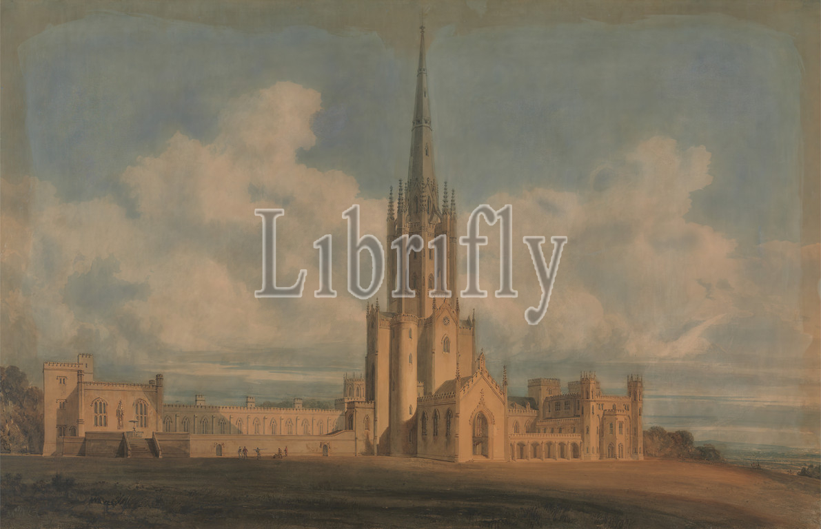 Projected Design for Fonthill Abbey, Wiltshire, James Wyatt, 1746–1813, British, And (?) Joseph Mallord William Turner, 1775–1851, British, 1798, Watercolor and graphite on slightly textured, cream wove paper, Frame: 28 1/2 x 43 1/2 x 2 inches (72.4 x 110.5 x 5.1 cm), abbey, architectural subject, church, design, horses (animals), riders, horseback, trees, workers, workers, England, Europe, Fonthill Abbey, Fonthill Gifford, United Kingdom, Wiltshire