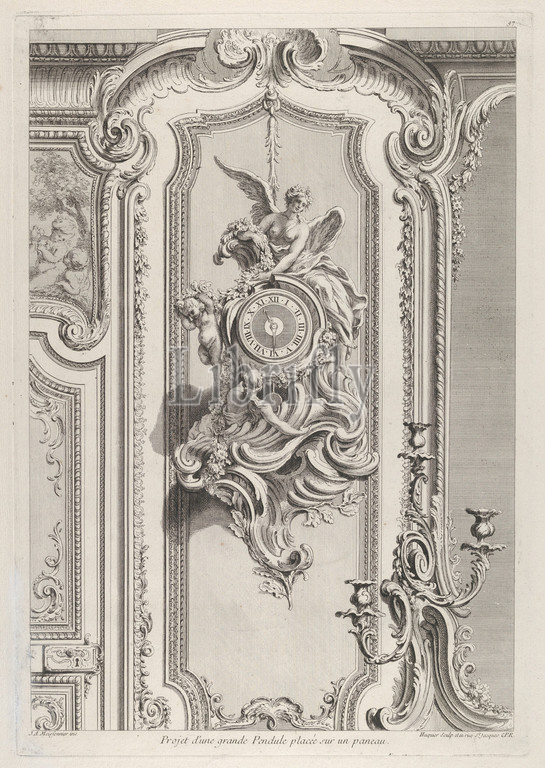 Projet d'une grande Pendule, from 'Oeuvre de Juste Aurele Meissonnier', ca. 1742–48, Etching and engraving, Plate: 18 7/8 × 13 in. (47.9 × 33 cm), Juste Aurèle Meissonnier (French, Turin 1695–1750 Paris), Design for a large pendule hung in front of a wall panel. The pendule has a round clock dial placed in a large case built up out of rocaille ornaments. On top a winged female figure holding a garland is seated