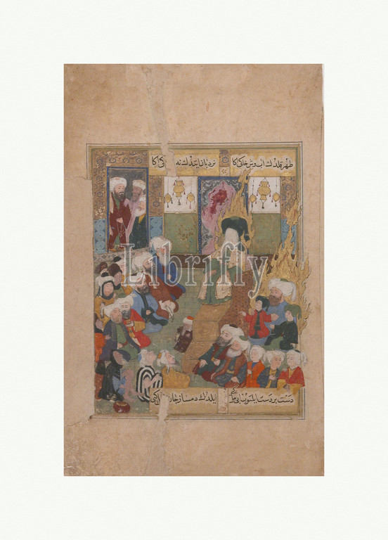 Prophet Muhammad Preaching, Folio, Maqtal, Al, Rasul, Lami, Chelebi, late 16th century, Attributed, Turkey, Iraq, Ink, opaque watercolor, gold, paper, H, 7 13/16, 19.8 cm, Codices, text, detached page, entitled, Murder, House, Prophet, tells, story, martyrdom, Husayn ibn, Ali, Muhammad, grandsons, son, assasination, battle, Karbala, present-day Iraq, represented, turning point, Muslim community, origin, main division, Sunni, Shi, sects