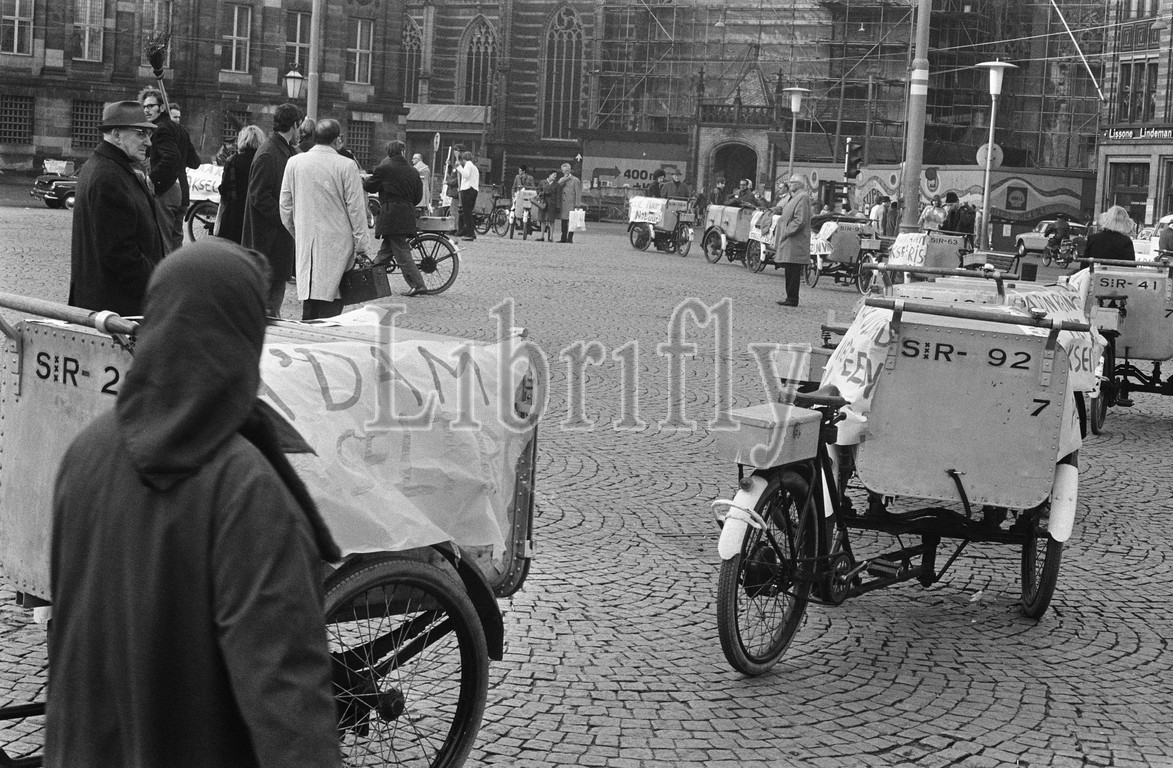 Protest parade of VU students against Pollution in Amsterdam with municipal cleaning carts. A statue was unveiled in the Vondelpark with banners /, November 6, 1969, Protest marches, SPANDOEKEN, statues, unveilings, students, The Netherlands, 20th century press agency photo, news to remember, documentary, historic photography 1945-1990, visual stories, human history of the Twentieth Century, capturing moments in time