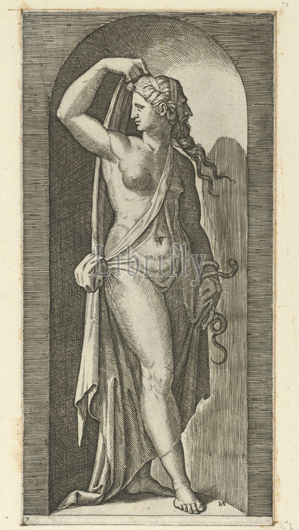 Prudence personified by a woman standing in a niche, holding a shawl in her right hand, a snake coiled around her, left from 'The Virtues', ca. 1515–25, Engraving, 8 11/16 x 4 1/4 in. (22.0 x 10.8 cm), Prints, Marcantonio Raimondi (Italian, Argini (?) ca. 1480–before 1534 Bologna (?)), After Raphael (Raffaello Sanzio or Santi) (Italian, Urbino 1483–1520 Rome)