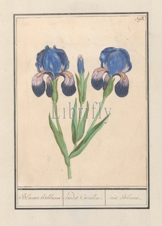 Purple iris, Iris germanica, Blue iris flower, irides Coeruleae, iris Bleues, title, object, Numbered top right, 198, Part, second album, drawings, flowers, plants, Ninth, twelve albums, animals, birds, 1600, commissioned, Emperor Rudolf II, explanations, Dutch, Latin, French, Flowers, NAME, Anselmus Boetius de Boodt, 1596, 1610, paper, watercolor, paint, deck paint, chalk, brush