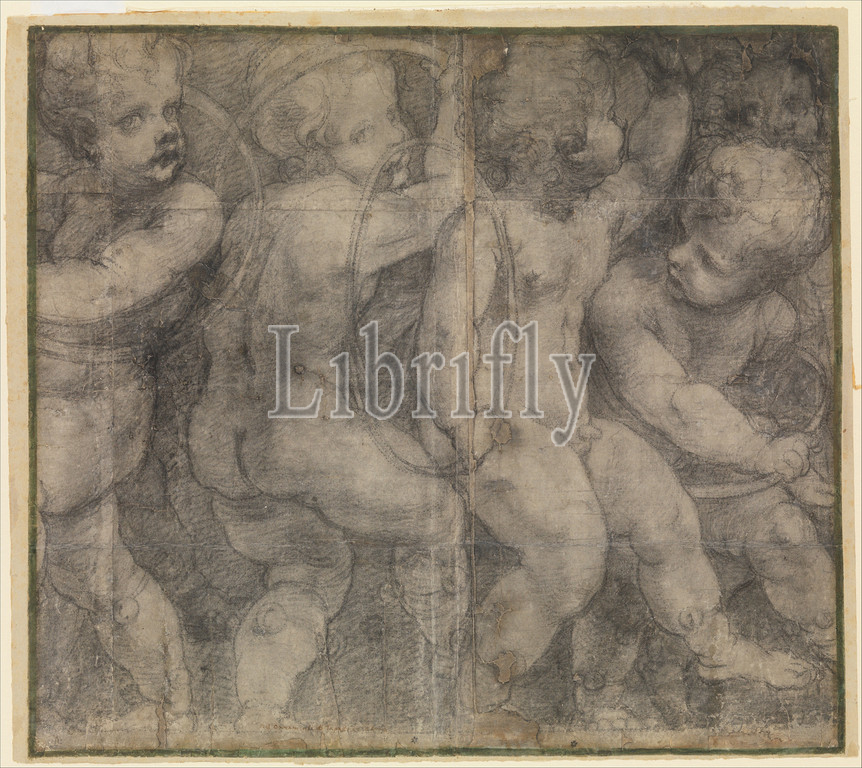 Putti Playing, Hoops, Cartoon, Fresco, Parma Cathedral, ca, 1548, Black chalk, outlines pricked, transfer, Sheet, 22, 24 13/16, 55.9, 63 cm, Drawings, Michelangelo Anselmi, Italian, Siena or Lucca, 1492–1556, Parma, rare, monumental cartoon, full-scale drawing, group, pleasingly plump children, arranged, friezelike composition, plays, hoops, outlines, figures, pricked, small holes, indicating, design, means, pouncing, technique, perforated outlines, rubbed, charcoal dust