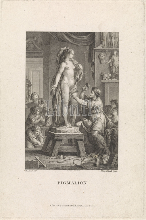 Pygmalion makes a statue of a woman The story of Pygmalion (series title) Pigmalion (series title on object), The king of Cyprus, Pygmalion, makes a statue of a naked woman in his workshop. His students assist him. The print is part of a series about the story of Pygmalion, Pygmalion falls in love with the statue he is carving, sculptor at work (in workshop or studio), sculptor at work (artist at work with assistants or pupils), Emmanuel Jean Nepomucene de Ghendt (mentioned on object), Paris, 1748 - 1815, paper, engraving, w 148 mm × h 223 mm