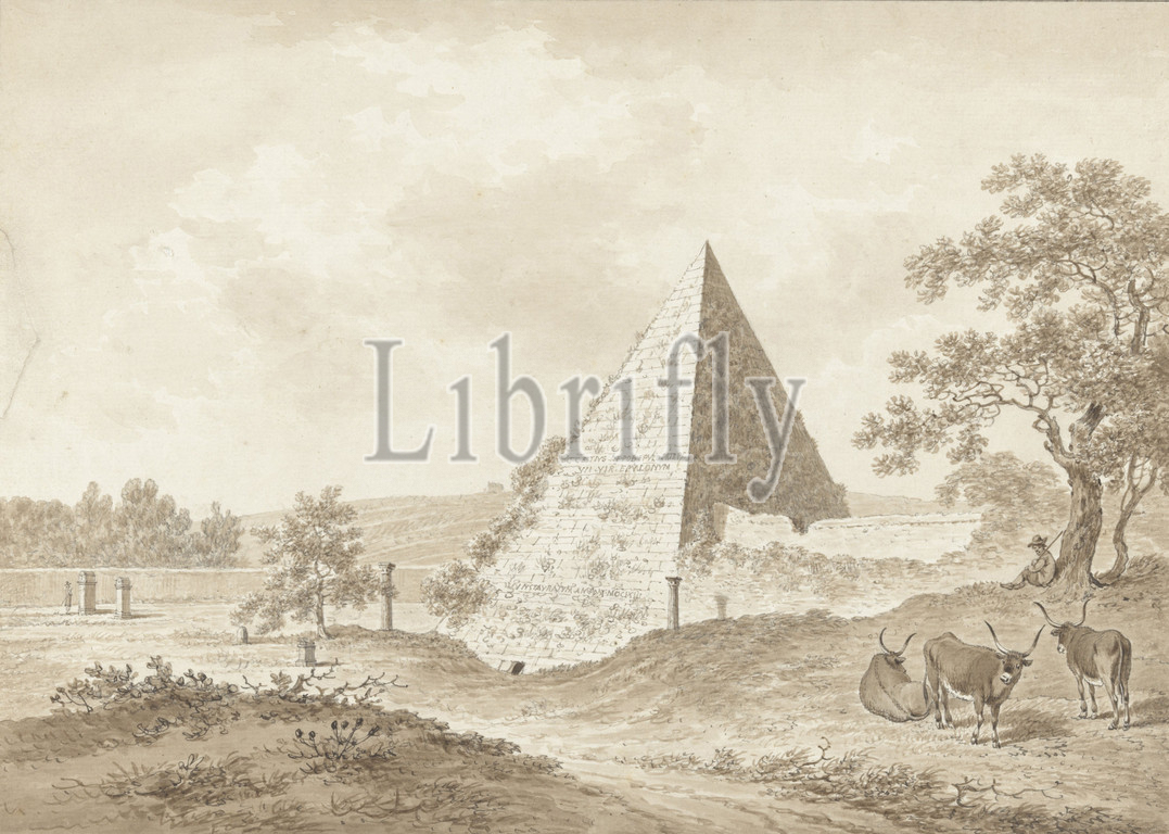 Pyramid, Cestius, Rome, Drawing, group, drawings, landscapes, cityscapes, Italy, Tivoli, Civita Castellana, Pozzuoli, Landscape, ruins, pyramid, marking grave, historical grave form, Daniel Dupré, 1761, 1817, paper, graphite, mineral, ink, brush