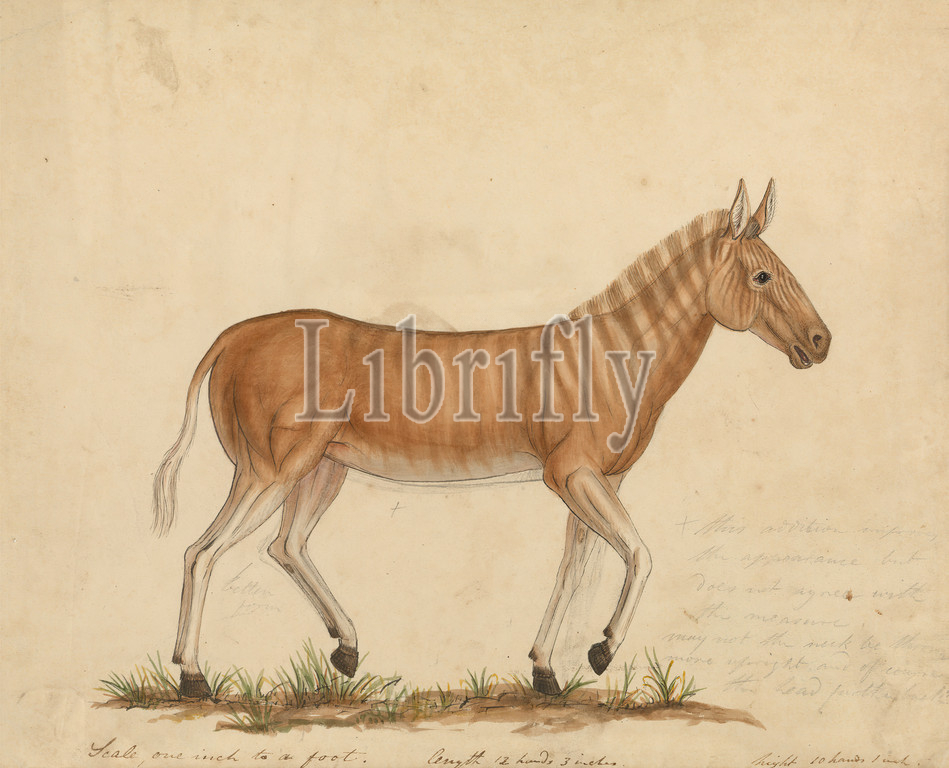 Quagga Zebra, James Sowerby, 1756–1822, British, James de Carle Sowerby, 1787–1871, British, Charles E, Sowerby, 1795–1842, British, ca, 1824, Watercolor, graphite, pen, black ink, medium, smooth, cream wove paper, Sheet, animal art, grass, zebra, mammal