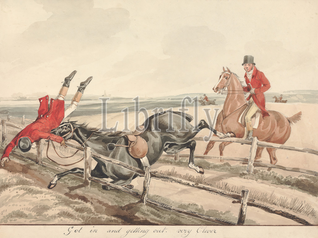 Qualified Horses, Unqualified Riders, 'Got, Getting Out., Clever, Henry Thomas Alken, 1785–1851, British, Watercolor, pen, black ink, brown ink, graphite, medium, slightly textured, blued white, wove paper, Sheet, Contemporary drawn border, Image, falling, fence, field, horseback riders, horseback riding, horses, animals, hunt, hunters, hunting, jumping, men, sporting art
