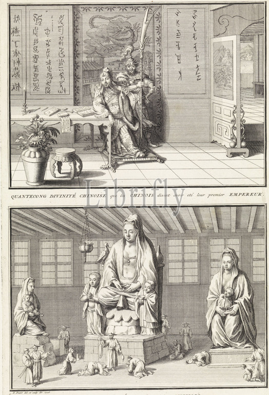 Quantekong, first emperor, China /, goddess Quonin, Bernard Picart, workshop, Bernard Picart, 1726, Sheet, two representations, Chinese gods, Chinese god, Quantekong, dressed, first emperor, sits next, table, stands, guard, statue, Chinese goddess Quonin, worshipped, print maker, Bernard Picart, workshop, Bernard Picart, mentioned, object, intermediary draughtsman, Bernard Picart, mentioned, object, Amsterdam, 1726, paper, etching, engraving, h 334 mm × w 222 mm