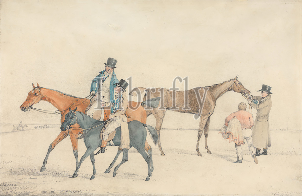 Race, Owner, Trainer Riding, Conversing, Jockey, Trainer's Hack, Right, Racehouse, Watered, Rugged, Racing, pair, Samuel Alken, 1756–1815, British, Graphite, watercolor, medium, slightly textured, cream, wove paper, Sheet, horse racing, horseback riders, horseback riding, horses, animals, jockeys, men, owner, sporting art