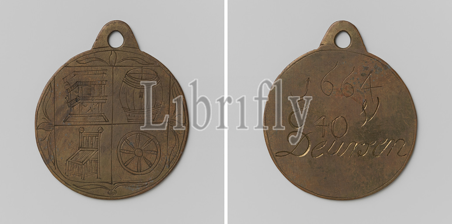 Rademakers, coopers, turners and carpenters 'or Four Crafts Guild of' s-Hertogenbosch, guild token by E. van Deursen with no. 40, Brass medal on the eyelet. Front: four-part shield containing a cupboard, a barrel, a chair and a wheel. Reverse: inscription, 's-Hertogenbosch, E. van Deursen, anonymous, s Hertogenbosch, 1664, brass (alloy), engraving, h 4.5 cm × d 3.9 cm × w 8.95 gr