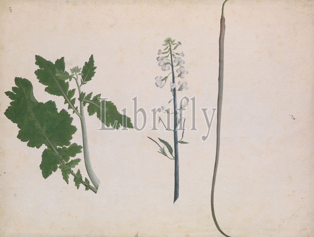 Radish Plant, Seed, Flower, late 18th century, India, Calcutta, Ink, opaque watercolor, paper, H, 18 3/4, 47.6 cm, Codices, painting, collection, Major James, Nathaniel, Rind, enthusiastic collector, 1778, 1804, unknown artist, work, identified, specimen, way, Persian writing, right side, page, reads muli, radish, depicted, three forms, plant, flowering form, finally, vegetable