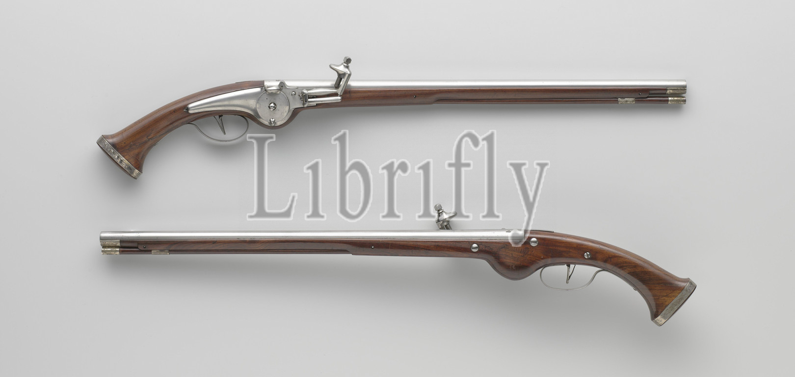 Radslotpistool, Part, couple, lock, unadorned, outer wheel, hook, underside, engraved, small o, round barrel, stamped, back, two marks, crown under, star, capital letter H, cartouche, palm branches under, bottom, indescribable, assemble, mark, 96-B, T, unadorned flask, rosewood, exception, loop-shaped iron trigger guard, fittings, black-and-white, consist, drawer hood, round loading tube, finials, band, butt knob engraved, floral scrolls, loading stick, black-and-white cap, Maastricht, 1645, 1650, wood, metal, engraving, l 70 8