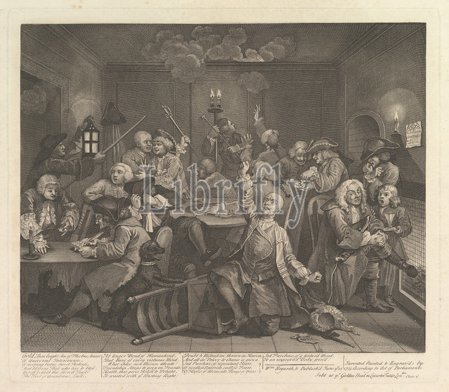 Rake, Progress, Plate 6, June 25, 1735, Etching, engraving, third state, three, plate, 14 x 16 1/4, 35.6 41.2 cm, Prints, William Hogarth, British, London, 1697–1764