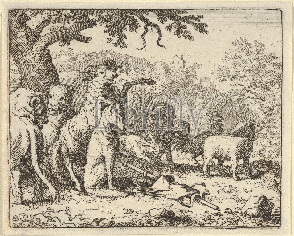The Ram, Chapelain of the Lion, Gives the Benediction to Renard before His Depature for Rome from Hendrick van Alcmar's Renard The Fox, 1650–75, Engraving; third state of four, Plate: 3 3/4 × 4 5/8 in. (9.6 × 11.8 cm), Prints, Allart van Everdingen (Dutch, Alkmaar 1621–1675 Amsterdam)