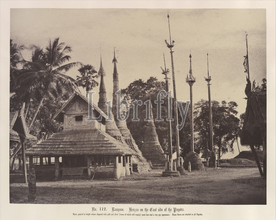 Rangoon: Henzas on the East Side of the Shwe Dagon Pagoda, November 1855, Albumen silver print from waxed paper negative, Image: 26.1 x 34.3 cm (10 1/4 x 13 1/2 in.), Photographs, Linnaeus Tripe (British, Devonport (Plymouth Dock) 1822–1902 Devonport), Taken from the wide platform on which the Shwe Dagon Pagoda rested, this photograph shows four wooden posts topped with carvings of birds that constituted pious offerings. Burmese art featured various birds, including the hintha, which Tripe called 'henza