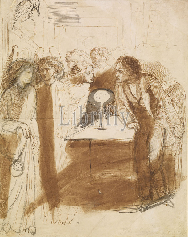 Raven, Angel Footfalls, 1847 Dante Gabriel Rossetti, man rises, chair, gaze, face, angel, Drawing, Ink, Angel, Sketch, Pre-Raphaelite