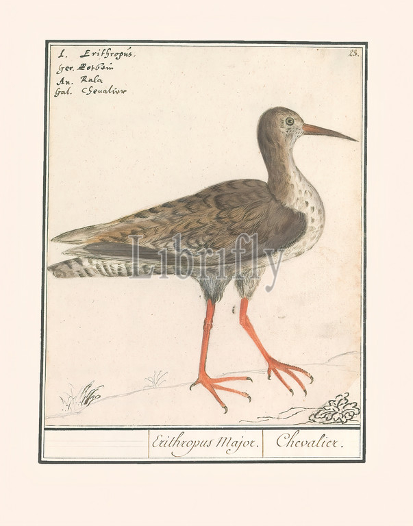 Redshank, Tringa totanus, Erithropus Major, Chevalier, title, object, Numbered top right, 23, Top left, name, four languages, Part, third album, drawings, birds, Fifth, twelve albums, animals, plants, 1600, commissioned, Emperor Rudolf II, explanation, Dutch, Latin, French, Anselmus Boetius de Boodt, 1596, 1610, paper, watercolor, paint, deck paint, pencil, chalk, ink, pen