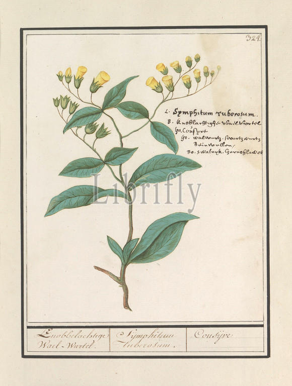 Regular comfrey, Symphytum officinale, Knobbelige Wael-Wurtel, Sijmphitum Tuberosum, Consijve, title, object, Comfrey, waltroot, Numbered top right, 324, Right, name, five languages, Part, fourth album, drawings, flowers, mushrooms, Eleventh, twelve albums, animals, birds, plants, 1600, commissioned, Emperor Rudolf II, explanations, Dutch, Latin, French, Anselmus Boetius de Boodt, 1596, 1610, paper, watercolor, paint, deck paint, chalk, ink, pen