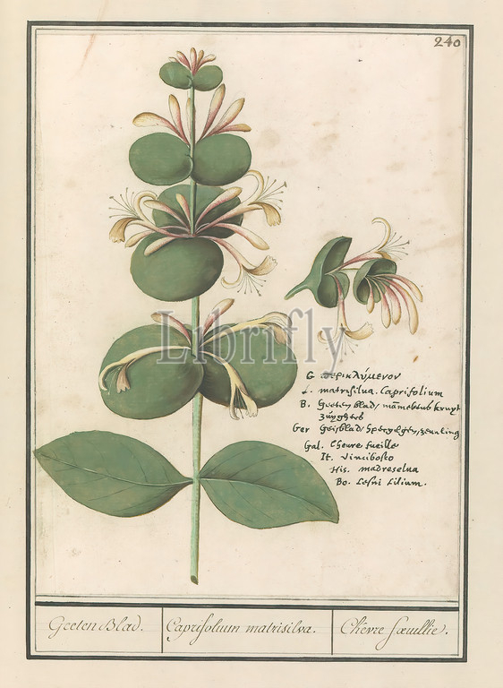 Regular honeysuckle, Lonicera caprifolium, Geelen Blad, Caprifolium matrisilva, Chêvre foeuillie, title, object, Garden honeysuckle, regular honeysuckle, Numbered top right, 240, Right, name, eight languages, Part, third album, drawings, flowers, plants, Tenth, twelve albums, animals, birds, 1600, commissioned, Emperor Rudolf II, explanation, Dutch, Latin, French, Flowers, NAME, Anselmus Boetius de Boodt, 1596, 1610, paper, watercolor, paint, deck paint, chalk, ink, pen