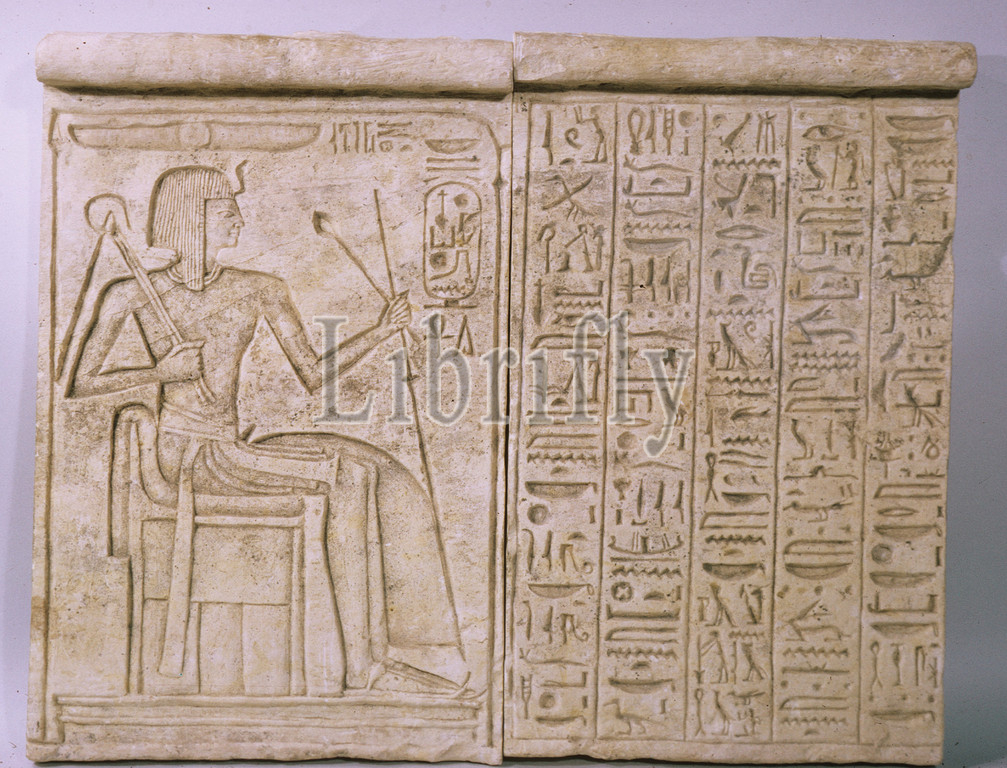 Relief of Ramesses IX, New Kingdom, Ramesside, Dynasty 20, ca. 1126–1108 B.C., From Egypt, Limestone, H. 45 cm (17 11/16 in); w. 57 cm (22 7/16 in), Ramesses IX is shown seated at left within a shrine, facing a hymn of praise in his honor. The inscription likens the king to the creator gods Ra and Khnum. The rather summary carrying of the stela and the uneven phrasing of the text illustrate the decline of Ramesside art in the late 20th Dynasty