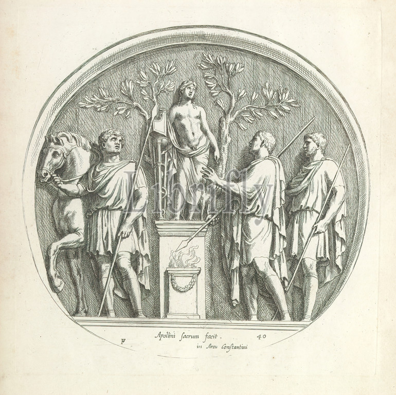 Relief showing, Roman emperor, offering, Diana, Roman sculpted reliefs, series title, Icones et segment, series title, object, Relief showing, Roman emperor standing, statue, goddess Diana, offering, left, man, spear next, emperor, right two men, spears, Text, Latin, lower margin, Print, part, album, print maker, François Perrier, mentioned, object, Giovanni Pietro Bellori, publisher, weduwe François Perrier, print maker, Paris, publisher, Paris, Vaticaanstad, 1645, paper, etching, height 260 mm × width 257 mm