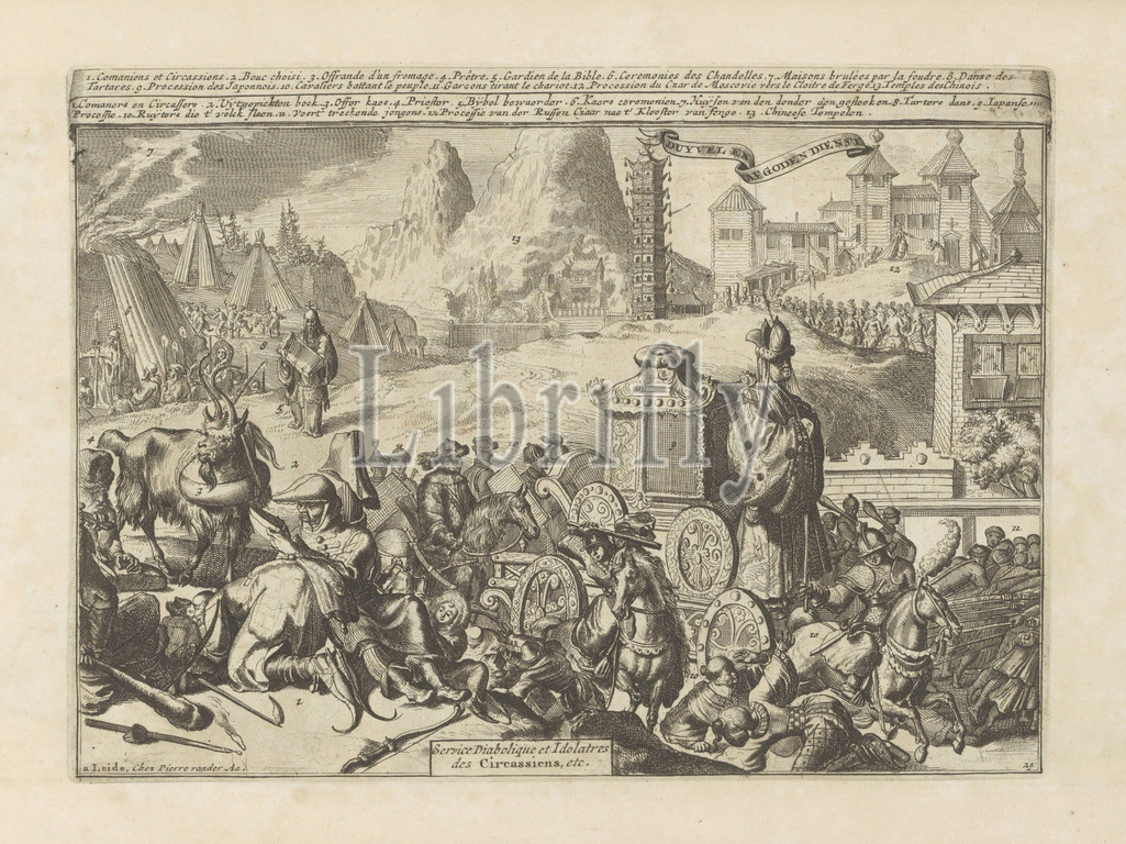 Religious acts and ceremonies in the East Indies, Duyvel and idolatrous service, Service Diabolique et Idolatres des Circassiens, etc (title on object), Les Indes Orientales et Occidentales et autres lieux (series title), Landscape with various religious acts or ceremonies. On the left, a goat with a sacrificial cheese around its neck. Behind it a bible keeper and a candle ceremony. On the left, a Japanese procession. The statue of the gods on a cart is pulled by boys on ropes. Behind it a procession of the Russian Tsar, ending at a monastery. With a legend in Dutch and French. The print is part of an album., print maker: Romeyn de Hooghe, publisher: Pieter van der Aa (I) (mentioned on object), Leiden, 1682 - 1733, paper, etching, height 210 mm × width 289 mm