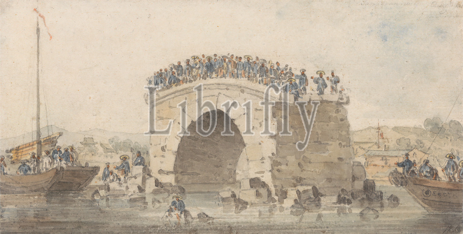 Remains, Bridge, San-Sien-Wey, Pei-Ho, Tong-Tcheou, August 15, 1793, William Alexander, 1767–1816, British, 1793, Watercolor, graphite, medium, smooth, cream laid paper, Sheet, architectural subject, boats, bridge, built work, figures, genre subject, landscape, men, punt, boat, river, ruins, ship, Asia, China, Hai, Tianjin Shi