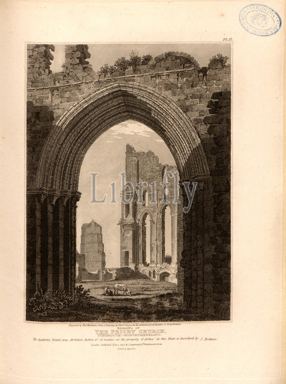 Remains, priory church Tynemouth, Northumberland, Tynemouth Priory ruin, Tynemouth, signed, Engraved, Tho., Matthews, Drawing, Edw., Dayes, Published, Longman &, Co, Fig. 33, Pl. II, p. 110, Edward, drawing, Thomas, engraving, Longman & Co., published, 1813, John Britton, architectural antiquities, Great Britain, represented, illustrated, series, views, elevations, plans, sections, details, various ancient English edifices, historical, descriptive accounts, Bd, 4, London, J, Taylor, 1807-1826