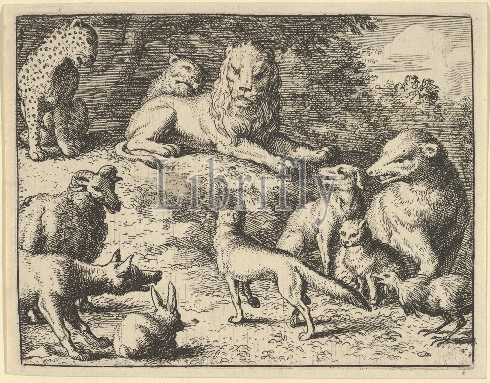 Renard is Accused by the Animals Before the Lion from Hendrick van Alcmar's Renard The Fox, 1650–75, Engraving; third state of four, Plate: 3 9/16 × 4 5/8 in. (9.1 × 11.8 cm), Prints, Allart van Everdingen (Dutch, Alkmaar 1621–1675 Amsterdam)