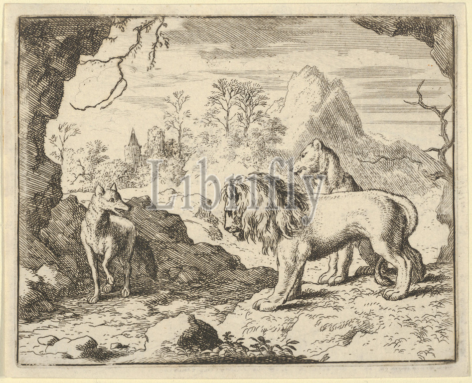 Renard Convinces, Lion, Lioness, Finding, Treasure, Father Stole, Them, Hendrick van Alcmar, Renard, Fox, 1650–75, Engraving, second state, three, Plate, 3 5/8, 4 9/16, 9.2, 11.6 cm, Prints, Allart Everdingen, Dutch, Alkmaar, 1621–1675, Amsterdam