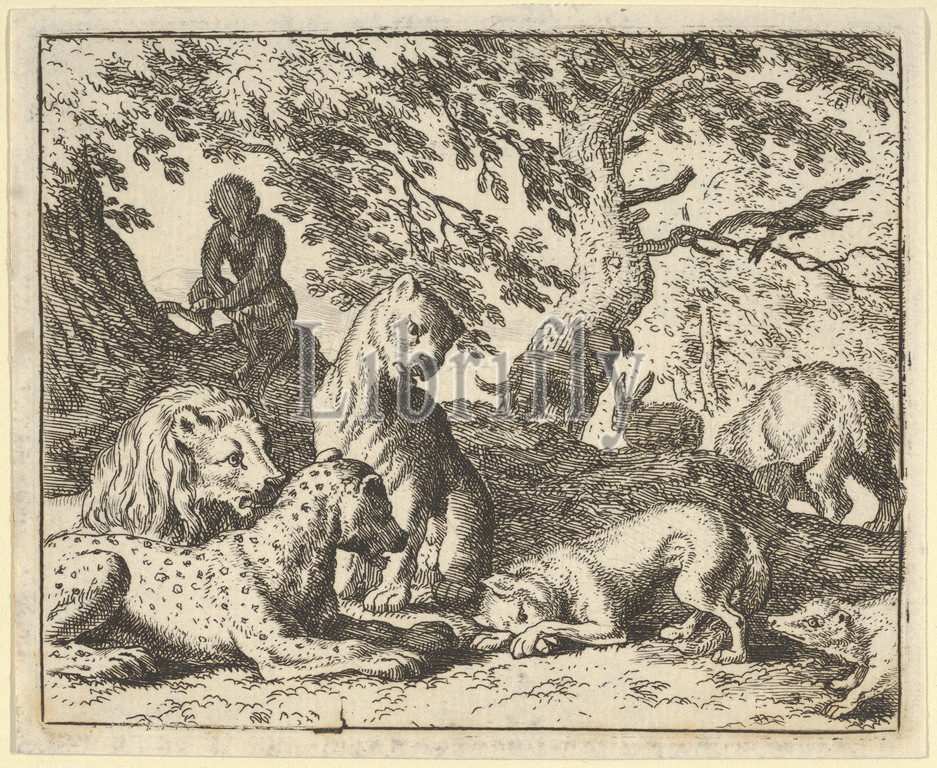 Renard Falsely Accuses, Father, Conspiring, Lion, Hendrick van Alcmar, Renard, Fox, 1650–75, Engraving, third state, four, Plate, 3 5/8, 4 1/2, 9.2, 11.4 cm, Prints, Allart Everdingen, Dutch, Alkmaar, 1621–1675, Amsterdam