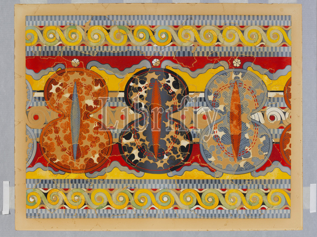 Reproduction, Shield frieze, fresco, Late Helladic IIIA-B, ca, 1325–1250 B.C, Mycenaean, watercolor, paper, Overall, 39 1/2 x 32, 100.3 81.3 cm, Excavated 1910, Inner Forecourt, Tiryns palace., original restoration, done, E, Gillieron, pere, two hundred, fragments, German Archaeological, Society, Evans, basis, grand, shield frescoes, Domestic Quarter, Knossos, executed