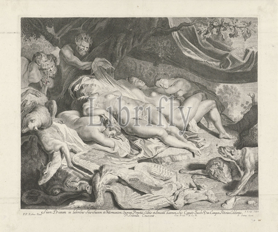 Rest, Diana, nymphs, hunt, resting, spied, three satyrs, killed animals, lying, floor, front, nymphs surprised, satyrs, Jacob Louys, mentioned, object, Haarlem, 1644, 1650, paper, engraving