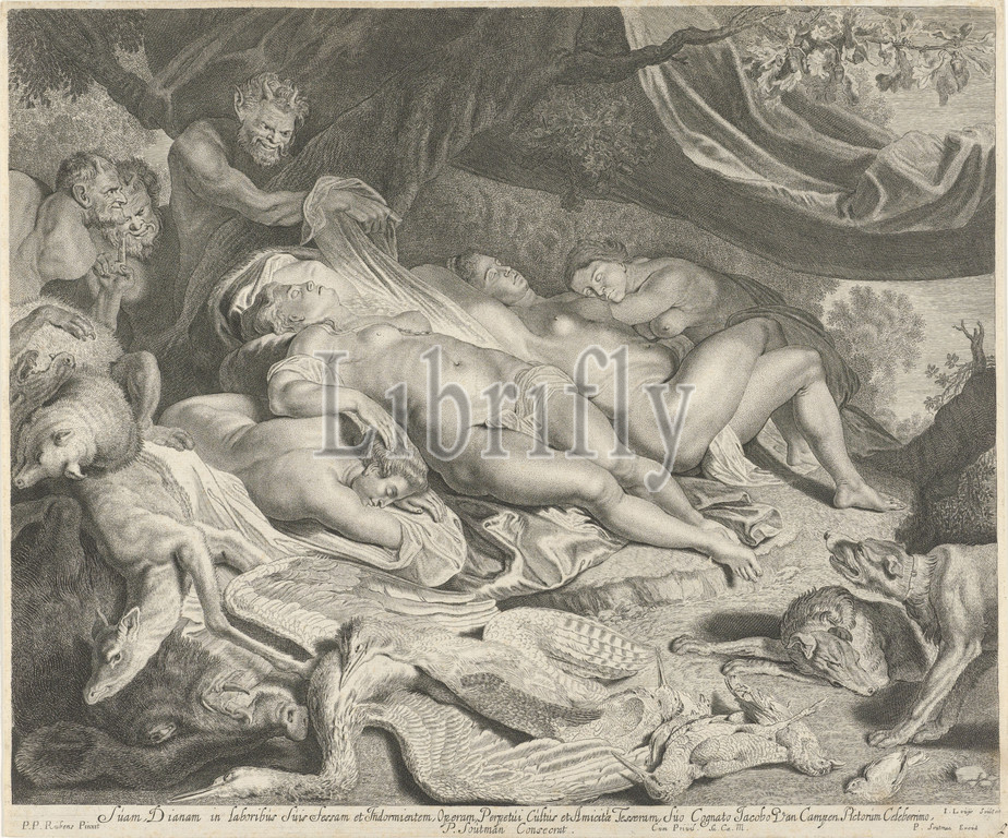 Rest, Diana, nymphs, hunt, resting, spied, three satyrs, killed animals, lying, floor, front, nymphs surprised, satyrs, Jacob Louys, mentioned, object, Haarlem, 1644, 1650, paper, engraving