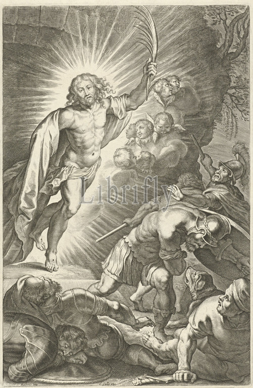 Resurrection, Christ, Christ rises, grave, Angels surround, sleeping soldiers wake up, flee, usually holding, banner, arises, combined, sleeping, frightened soldiers, Antwerp, 1614, 1650, paper, engraving