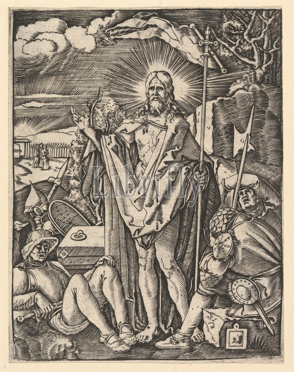 Resurrection, Christ standing, front, closed tomb, holding, flag, giving, blessing, guards sleeping, foreground, Dürer, ca, 1500–1534, Engraving, third state, three, Sheet, 5 1/16, 3 15/16, 12.9, 10 cm, Prints, Marcantonio Raimondi, Italian, Argini, ca., 1480–before, 1534, Bologna, After Albrecht Dürer, German, Nuremberg, 1471–1528