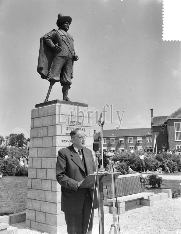 Revealing statue Pieter Stuyvesant by minister Kernkamp at Wolvega, 12 July 1955, Ministers, Revealing, Statues, The Netherlands, 20th century press agency photo, news to remember, documentary, historic photography 1945-1990, visual stories, human history of the Twentieth Century, capturing moments in time