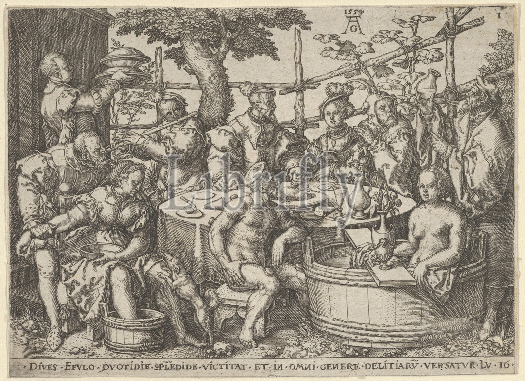 The Rich Man at His Table, from The Parable of the Rich Man and Lazarus, 1554, Engraving, Sheet: 3 1/8 × 4 5/16 in. (8 × 11 cm), Prints, Heinrich Aldegrever (German, Paderborn ca. 1502–1555/1561 Soest), Dives, at center, dining with a woman before a trellis. A variety of other figures are gathered around the table, including at woman in a bath, a flautist, a fool, a figure letting blood from a seated female, and a servant bringing food to the table