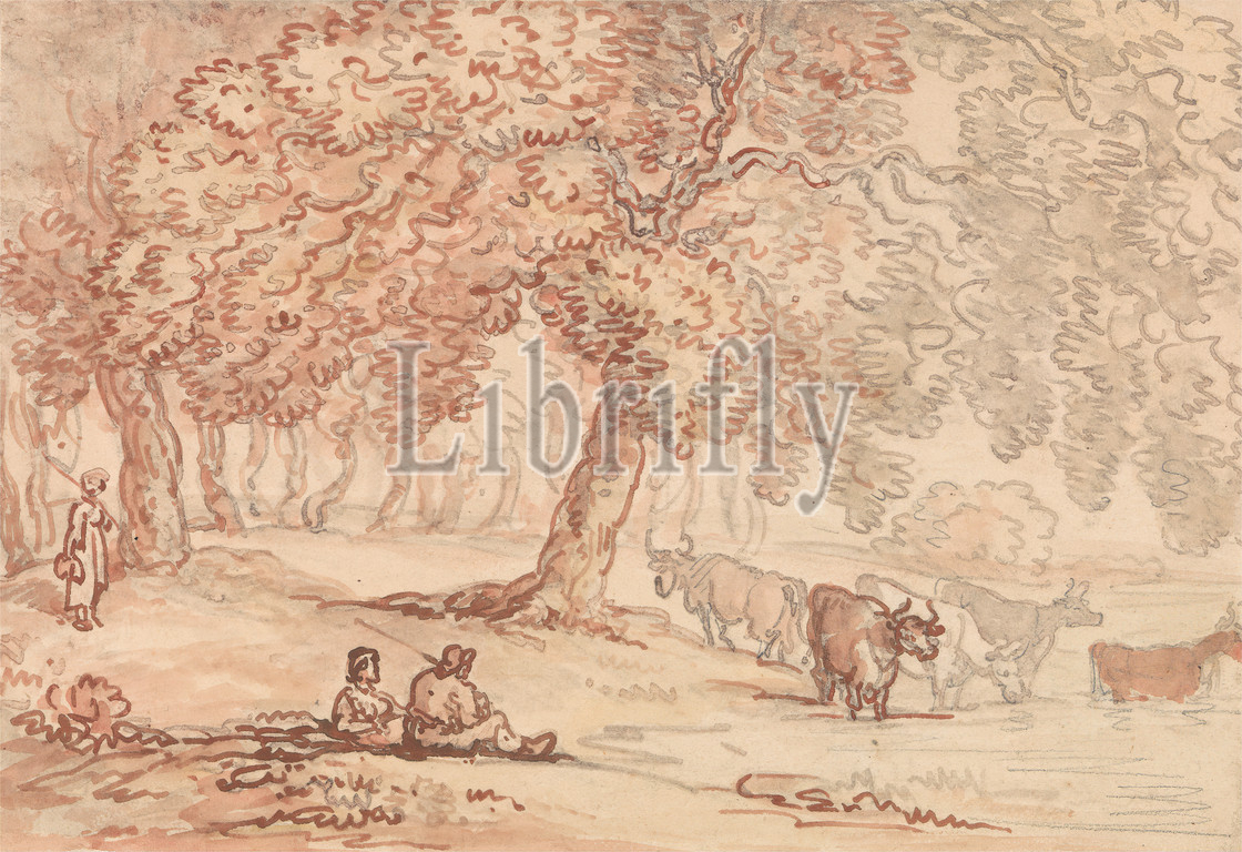 Richmond Park, Thomas Rowlandson, 1756–1827, British, Watercolor, graphite, pen, gray ink, pen, red ink, medium, slightly textured, cream wove paper, Mount, Sheet, cattle, figures, landscape, park, grounds, trees, England, Europe, Ham, London, North Yorkshire, Richmond, Richmond Park, Richmond upon Thames, United Kingdom, Yorkshire