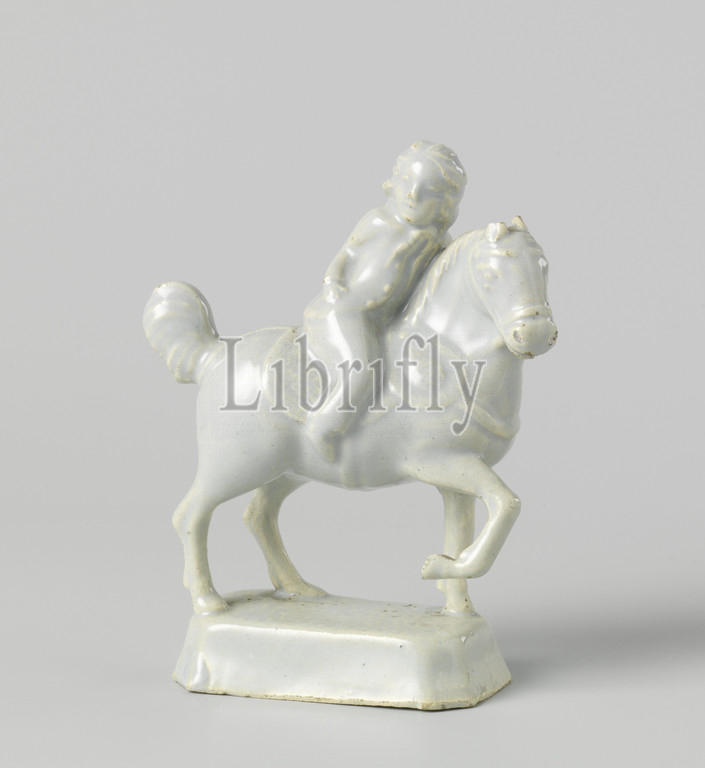Rider, horseback, Statue, undecorated faience, rider, riding, horse, rectangular pedestal, beveled corners, bent, left foreleg, rider leans forward, horse's neck, Delft, c, 1780, 1820, earthenware, tin glaze