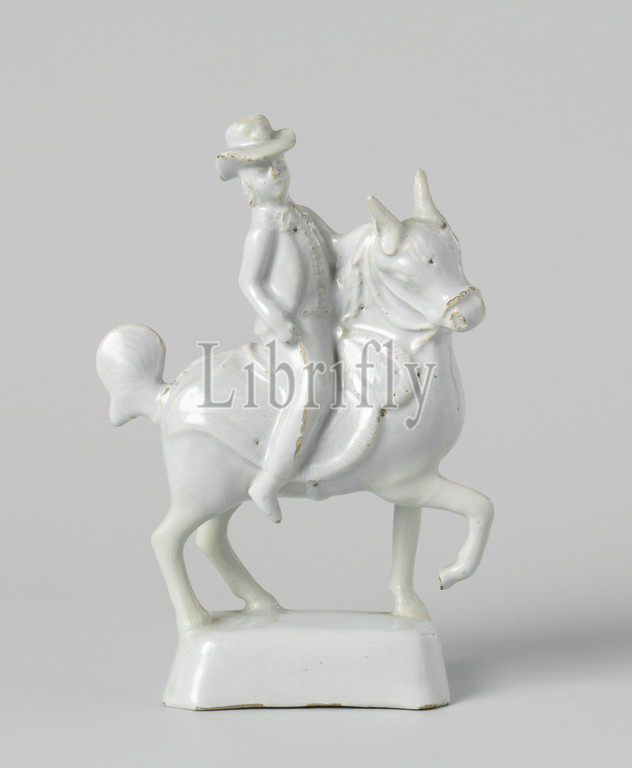 Rider, horseback, Statue, undecorated faience, rider, riding, horse, rectangular pedestal, beveled corners, bent, right foreleg, wearing, round hat, Delft, c, 1780, 1820, earthenware, tin glaze