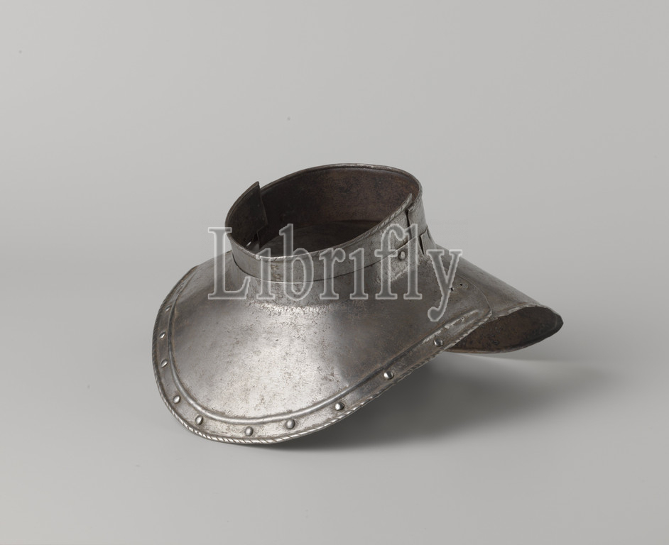 Ring collar, iron, blank, made of four parts that are riveted together on both sides of the opening with round opening in the middle. The edges are flanged up and are cabled. At the front a slightly curved edge with iron rivets in between. The opening for the head has a flanged rim that is cabled, consists of two parts that are riveted together on both sides from the inside. The inside is painted black., anonymous, Europe, 1499 - 1699, geheel, engraving, l 26.5 cm × w 30 cm × h 15.5 cm