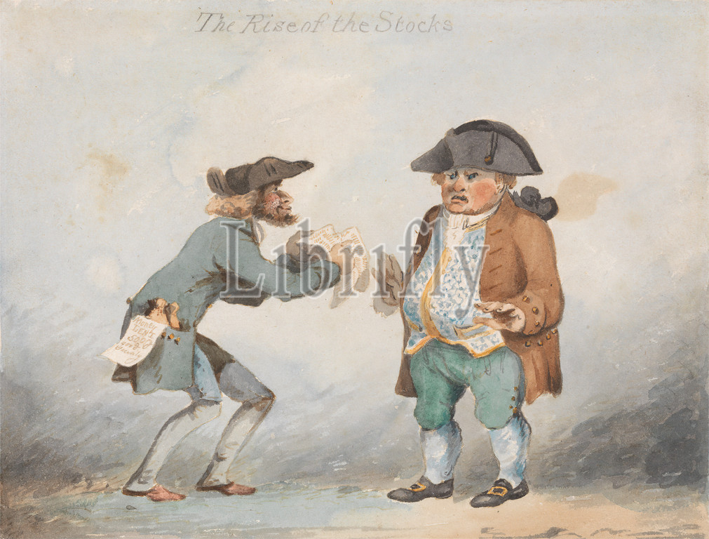 Rise, Stocks, Set, Three, John Sell Cotman, 1782–1842, British, Robert Dighton, 1752–1814, British, 1799, Watercolor, brown ink, graphite, medium, smooth, cream wove paper, Sheet, documents, figure study, men, stocks