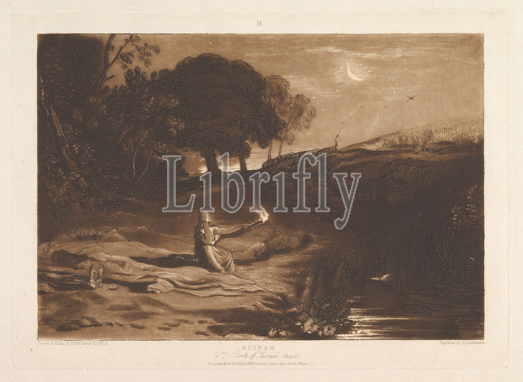 Rispah, 2nd Book, Samuel, Chapter 21, Liber Studiorum, part IX, plate 46, 23, 1812, Etching, mezzotint, fourth state, four, plate, 7 1/8 x 10 3/8, 18.1 26.4 cm, Prints, Designed and etched by Joseph Mallord William Turner, British, London, 1775–1851, Turner distilled, ideas, landscape, Latin, Book, Studies, series, seventy prints, plus, frontispiece published, 1807, 1819, establish, compositions, brown watercolor, drawings, etched outlines, copper plates