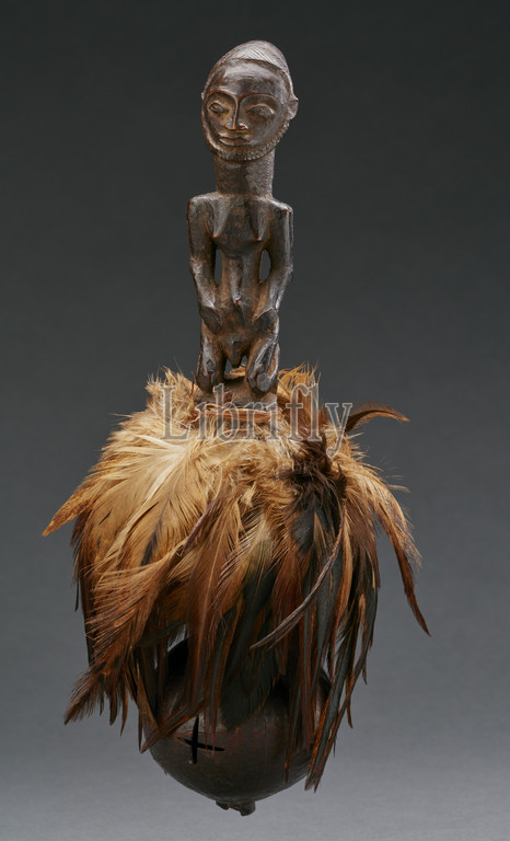 ritual rattle with human figure, Kusu, early 20th century, wood, gourd, feathers, fiber, H: 9-1/16 in., African Art