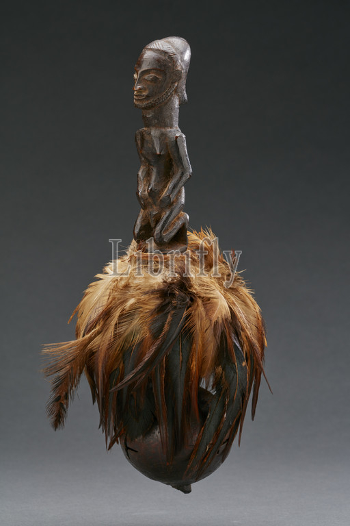ritual rattle with human figure, Kusu, early 20th century, wood, gourd, feathers, fiber, H: 9-1/16 in., African Art