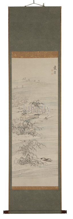River Village, Fishing Pleasure, Ike no Taiga, Japanese, 1723-1776, Edo, color, ink, paper, 45-5/8 x 16-1/2, image, 73-7/16 x 22-5/16, mounting w/ knobs, 73-7/16 x 18-7/8, mounting w/o knobs, Signed, Kasho Seal, Seal, Ike Mumei, Asian Art