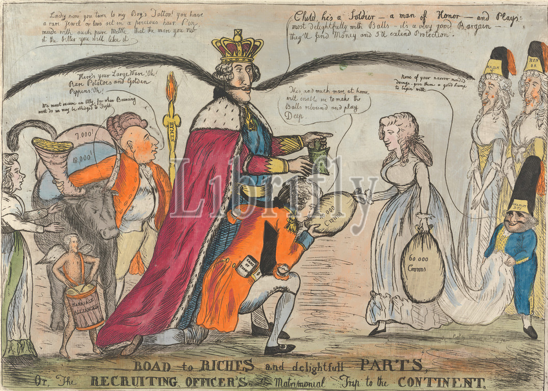 Road to Riches and delightfull Parts, Or, The Recruiting Officers ? Matrimonial Trip to the Continent., (?) William Dent, active 1784–1793, 1792, Line engraving with watercolor on laid paper, Sheet: 10 x 13 7/8in. (25.4 x 35.2cm)
