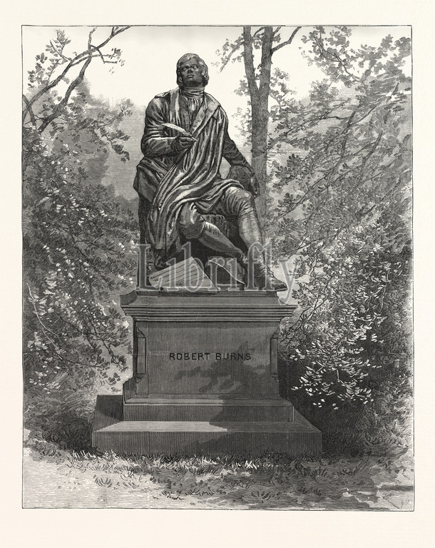 robert, burns, sculpture, monument, statue, sir, john, steell, central , public garden, recreation ground, playground, play area, public/municipal park, park. photographed, pach, engraving, 1880, usa, America